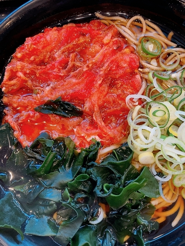 わかめも入っているのが富士そばの紅生姜天そばのスタイル。